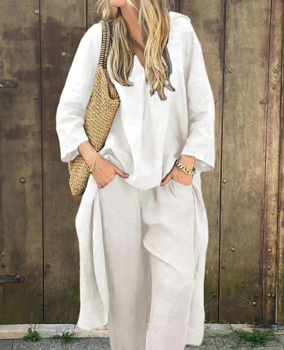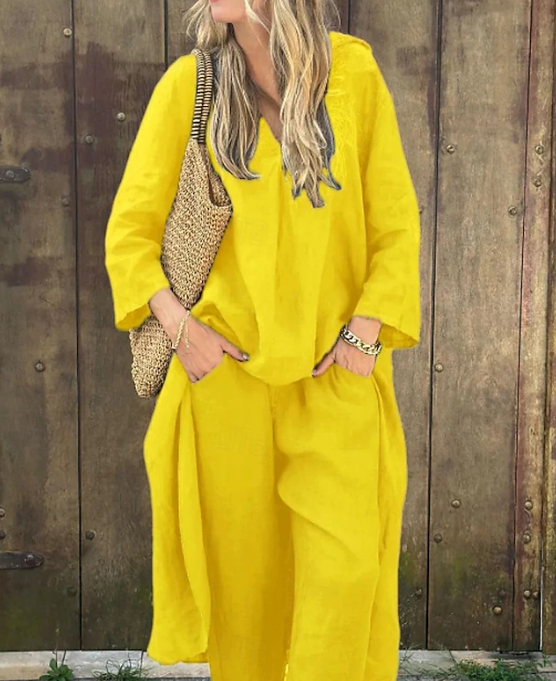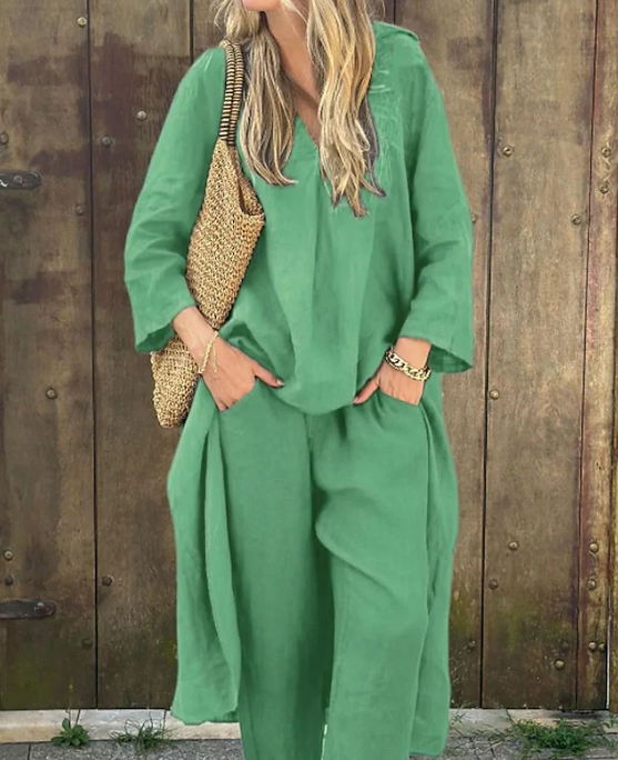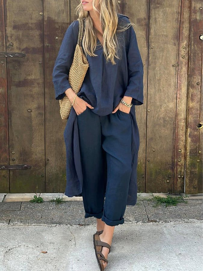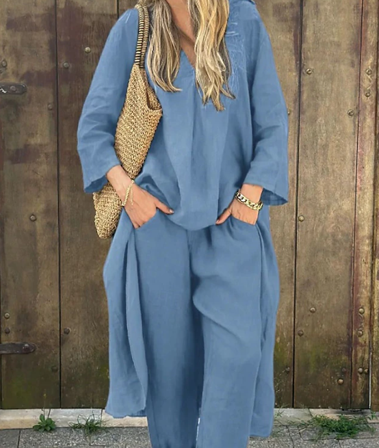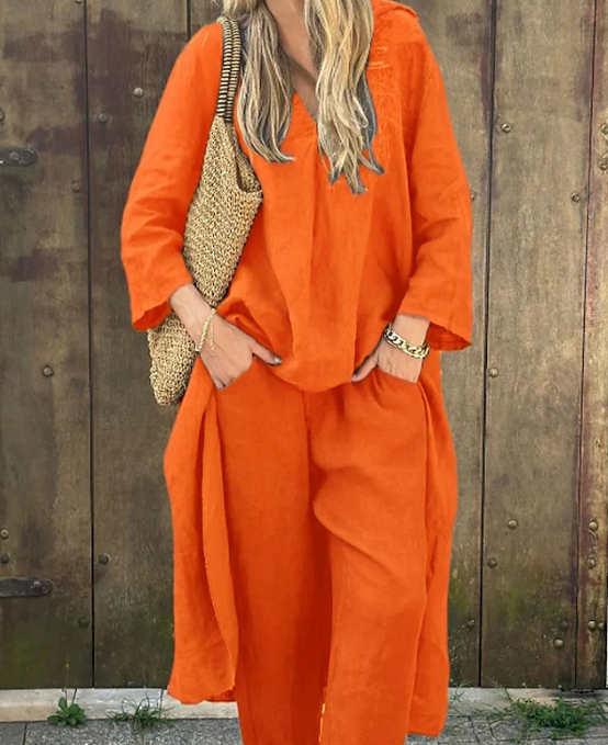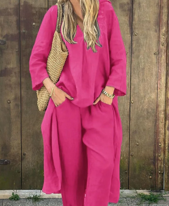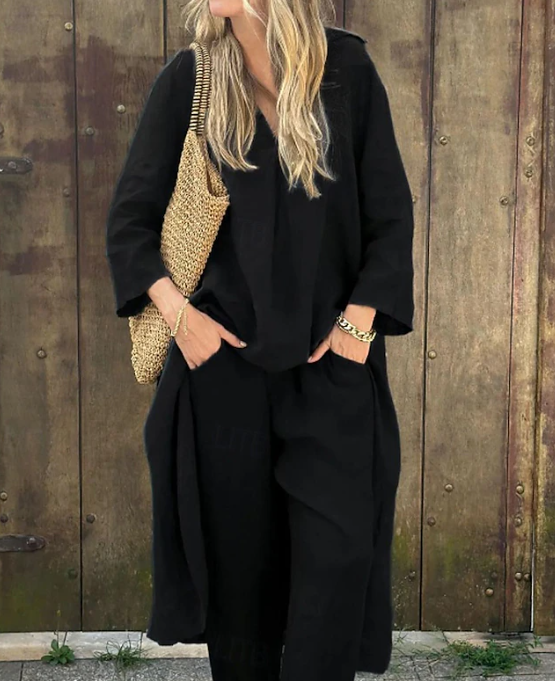 Craquez pour notre ensemble deux pièces au design raffiné : un haut long à manches longues et col en V, associé à un pantalon ample taille haute avec poches. Parfaitement pensé pour allier style, confort et praticité.